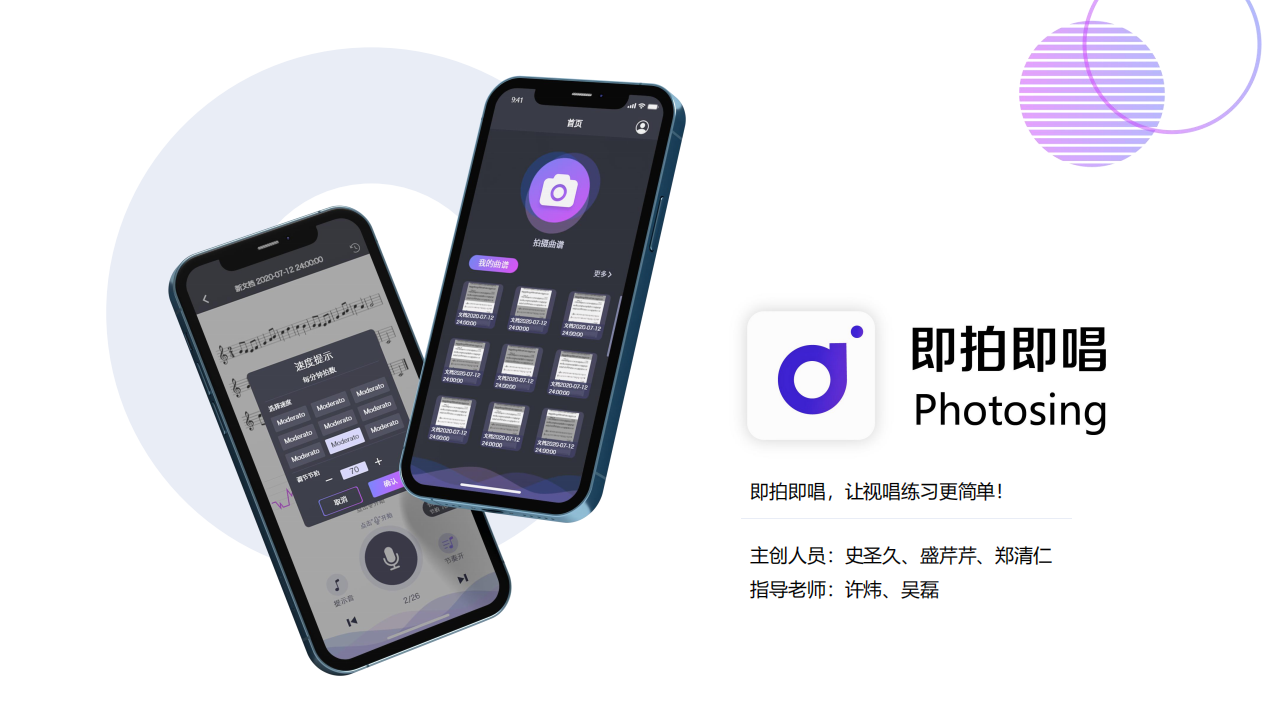 两支参赛队伍是:①即拍即唱:史圣久、盛芹芹、郑清仁;②记忆达人:陈雅楠、邹雅、毛泓沁。其中,即拍即唱是一款服务于音乐学习者(含专业艺考和业余音基/音乐素养考试)的智能辅助练习APP。它能够通过拍照识别纸质视唱乐谱,并根据乐谱对练习者的视唱进行自动评分,给出音高及节奏的反馈。它有效融合了视觉人工智能和音频人工智能算法,为视唱练习者提供了恰到好处的贴心服务。由于采用拍照识别乐谱的方式,也解除了相应的版权风险,给用户更大的自由,也给音乐出版与服务业态提供了更大的拓展空间。