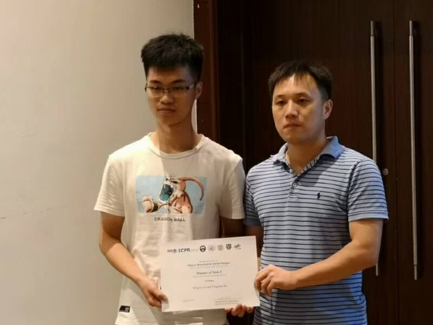 QY千亿球友会两支队伍在导师们的悉心指导下,经过两个多月的努力,在ODAI两个任务上均获得了优异成绩,并受到了比赛主办方的邀请于2018年8月20日参加ICPR 2018 Contests Special Session进行报告和领奖。图片为符明韬同学领奖照片。