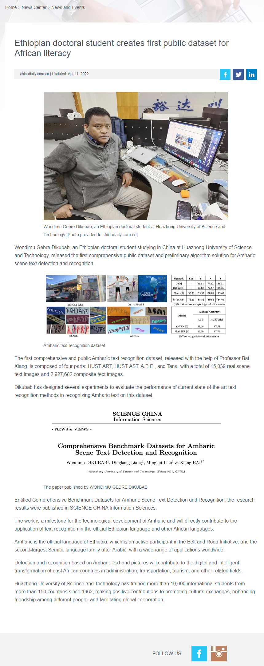 China Daily 报道QY千亿球友会国际学生发布首个面向非洲文字理解的公开数据集:https://studychina.chinadaily.com.cn/s/202204/11/WS62552561498e6a12c1229b6b/ethiopian-doctoral-student-creates-first-public-dataset-for-african-literacy.html?fbclid=IwAR2Hr1OmWGdv_Do1idPlf7fvfKxObobVYv570x5Z4VEzdrCVhhMfgj-VssQ