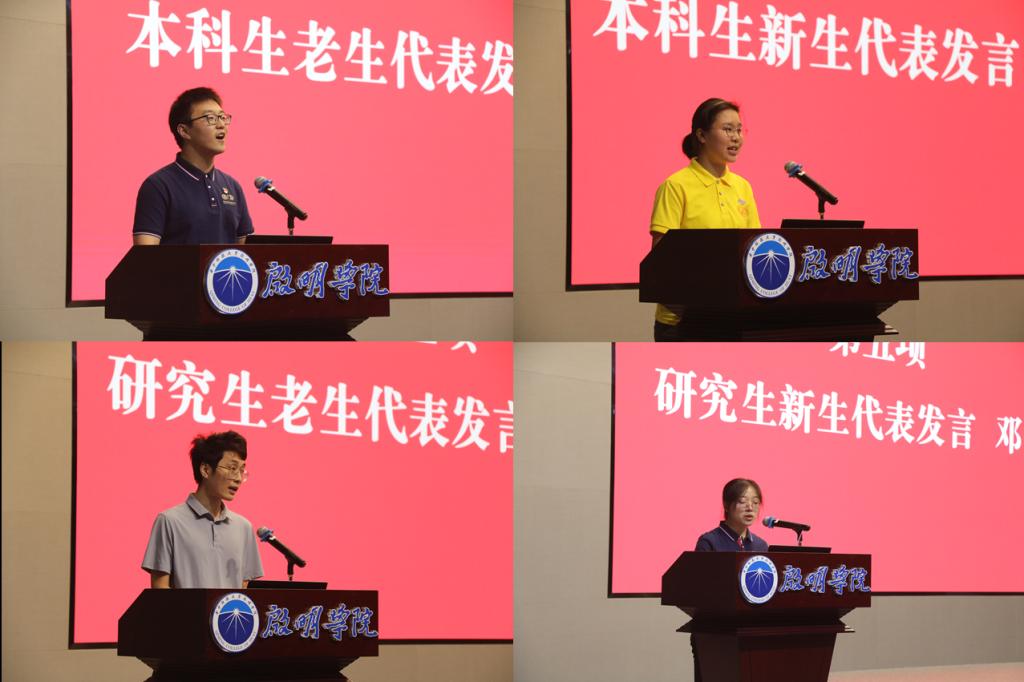 研究生老生代表、2019级博士研究生史天意讲述了电信学子11天上线了新冠肺炎辅助诊断系统,用科技助力抗疫,用行动守护人民生命健康的故事,希望同学们能写好“两篇文章”。研究生新生代表邓萌同学回忆了本科阶段在QY千亿球友会度过的美好时光,并建议全体新生:坚定目标,锲而不舍,做勤学奋发的孤勇者;勤于思考,锤炼思维,做开拓创新的追梦人;锐意进取,不负韶华,做科技报国的实干家。