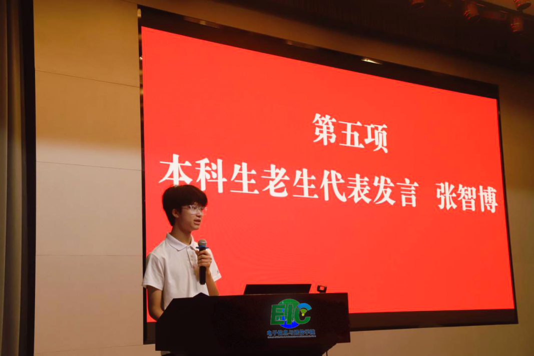 老生代表、院学生会主席团成员张智博号召同学要在大学生活中积极服务他人,闪耀青春活力,在志愿奉献中出彩,夯实专业基础,在科研上不断勇攀高峰,在新挑战下挺膺而出,做自强不息的电信骄子,做胸怀天下的喻园英才。