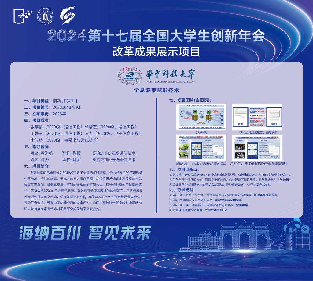 本项目研发低成本高效率的全息波束赋形阵列、首创高精度全息信道感知技术、设计低时延的干扰抑制算法,有效提升弱覆盖区域的信号强度。团队成员共发表顶刊顶会论文两篇,受理发明专利8项;与移动公司完成5G现网多场景联合测试,受到中国移动的高度评价;基于本项目,该团队获得第十八届“挑战杯”全国大学生课外学术科技作品竞赛主体赛全国特等奖、中国国际大学生创新大赛(2023)主赛道全国金奖。